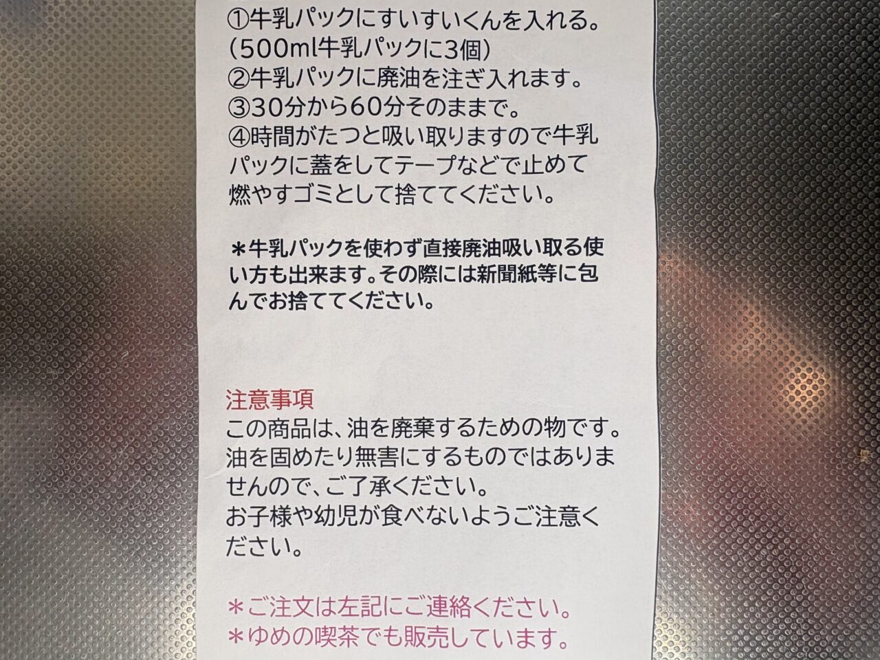 購入して試してみたところ、牛乳パックに入れて1時間ほどおくだけで、しっかりと油を吸い込んでくれました。手軽に使用済油を燃やすごみとして廃棄することができる便利アイテムです♪