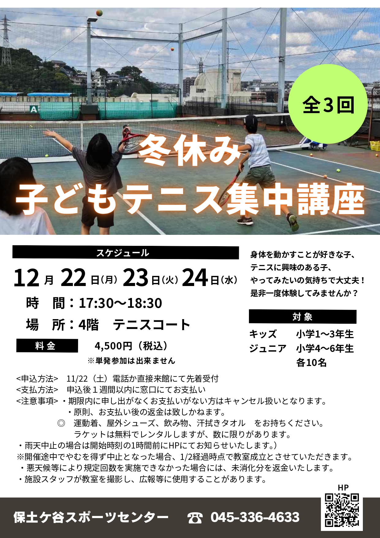 【横浜市保土ケ谷区】保土ケ谷スポーツセンターにて「冬休み子どもテニス集中講座」が開催!現在申込受付中です♪