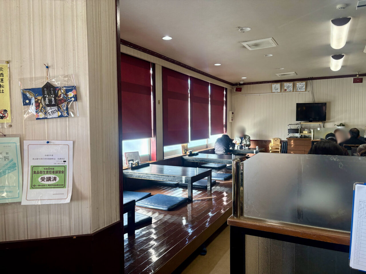 店内はテーブル席、座敷席、カウンター席がありますが、昼時には満席に!地元の方を中心に、根強いファンが多いことがうかがえます。