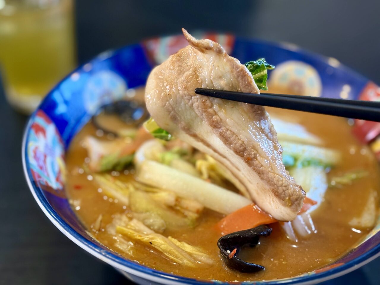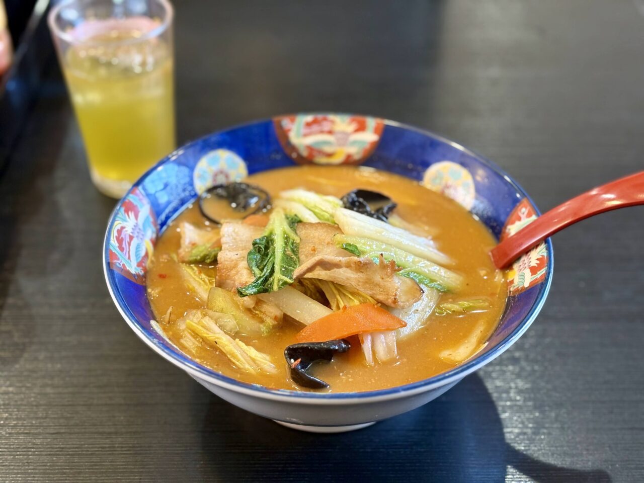 具材は白菜やニンジン、豚肉、きくらげなど。大きめのカットで存在感たっぷりです。シャキッとした野菜の食感と、味噌スープのコクが相性抜群で、食べごたえは十分。さらに中太の麺がスープをしっかりまとい、噛むたびに旨みが広がります。