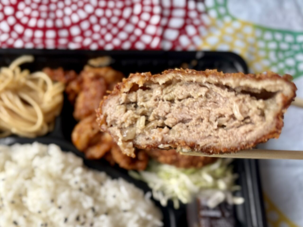 ひき肉がぎっしり詰まったメンチカツ。ボリューム満点で満足感のある一品です。