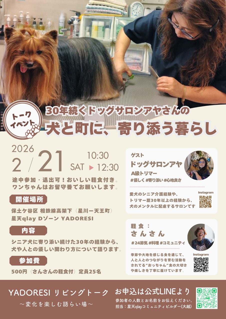 第4回目を迎える今回は、天王町で30年続く「ドッグサロンアヤ」さんがゲスト。シニア犬へのやさしいケアや、まちの人との丁寧なつながりについてをテーマに、参加者も交えて語り合う形でイベントが展開されます。