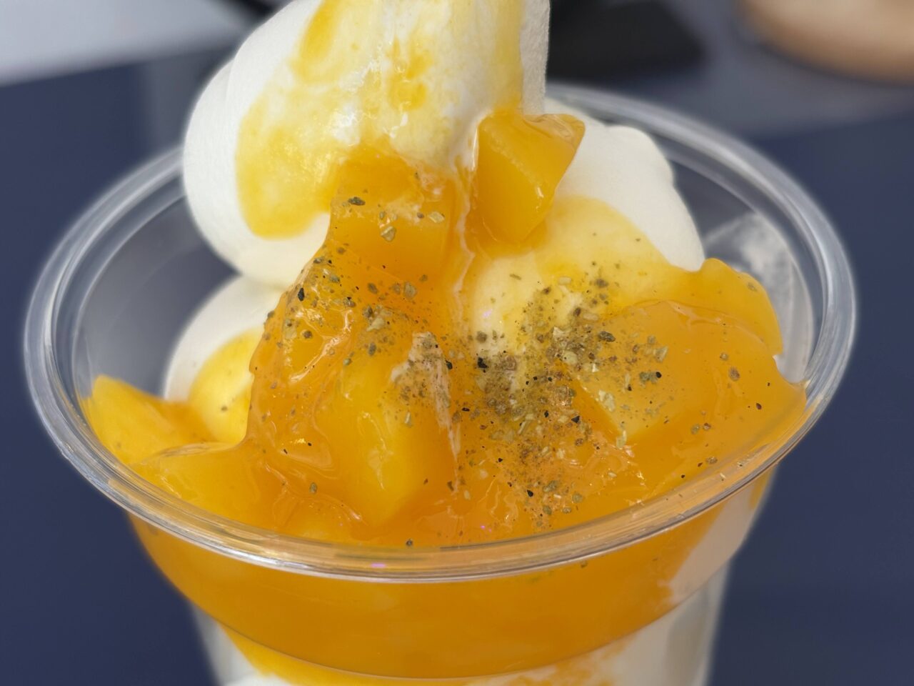 上にはフレッシュなマンゴーがたっぷり。とろける甘さとジューシーさがしっかり感じられます。なめらかでコクのある北海道ソフトクリームのやさしい甘さがマンゴーの濃厚さを包み込み、まろやかな味わいに。