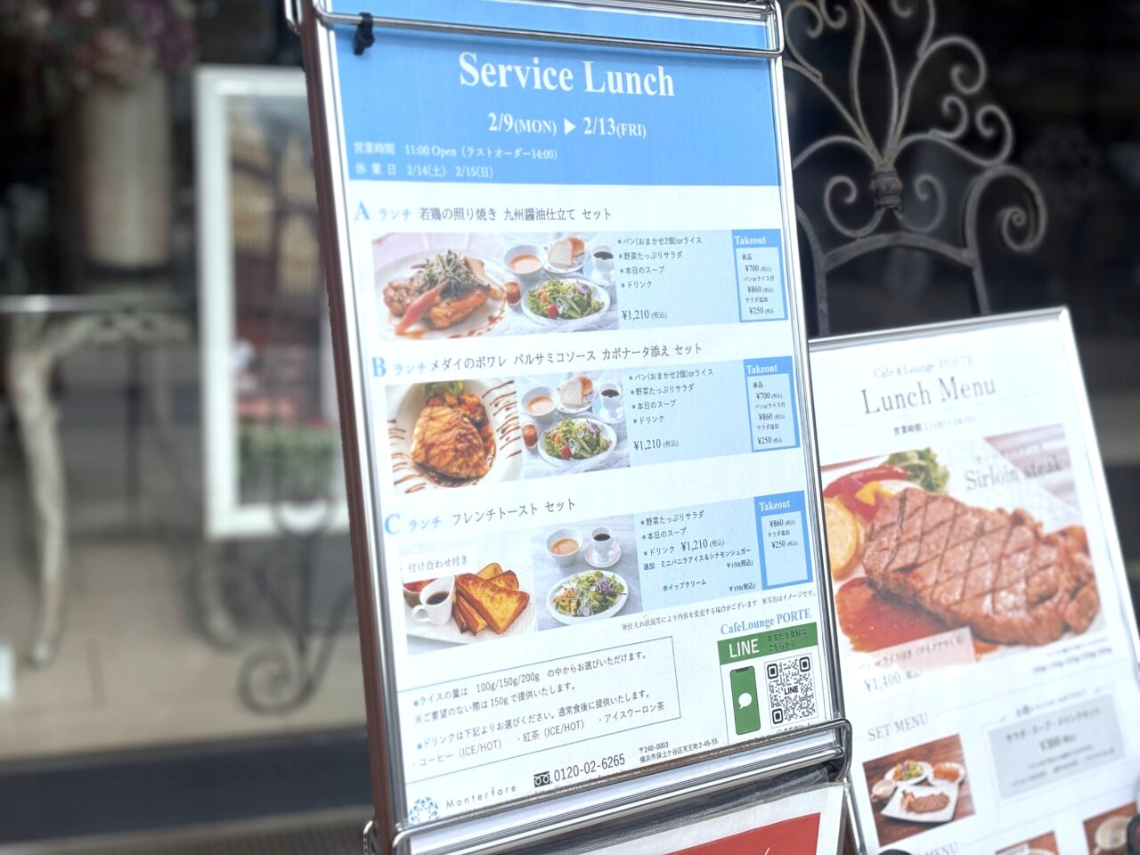 ランチメニューは週替わりの3種類のサービスランチと、サーロインステーキから選択ができます。