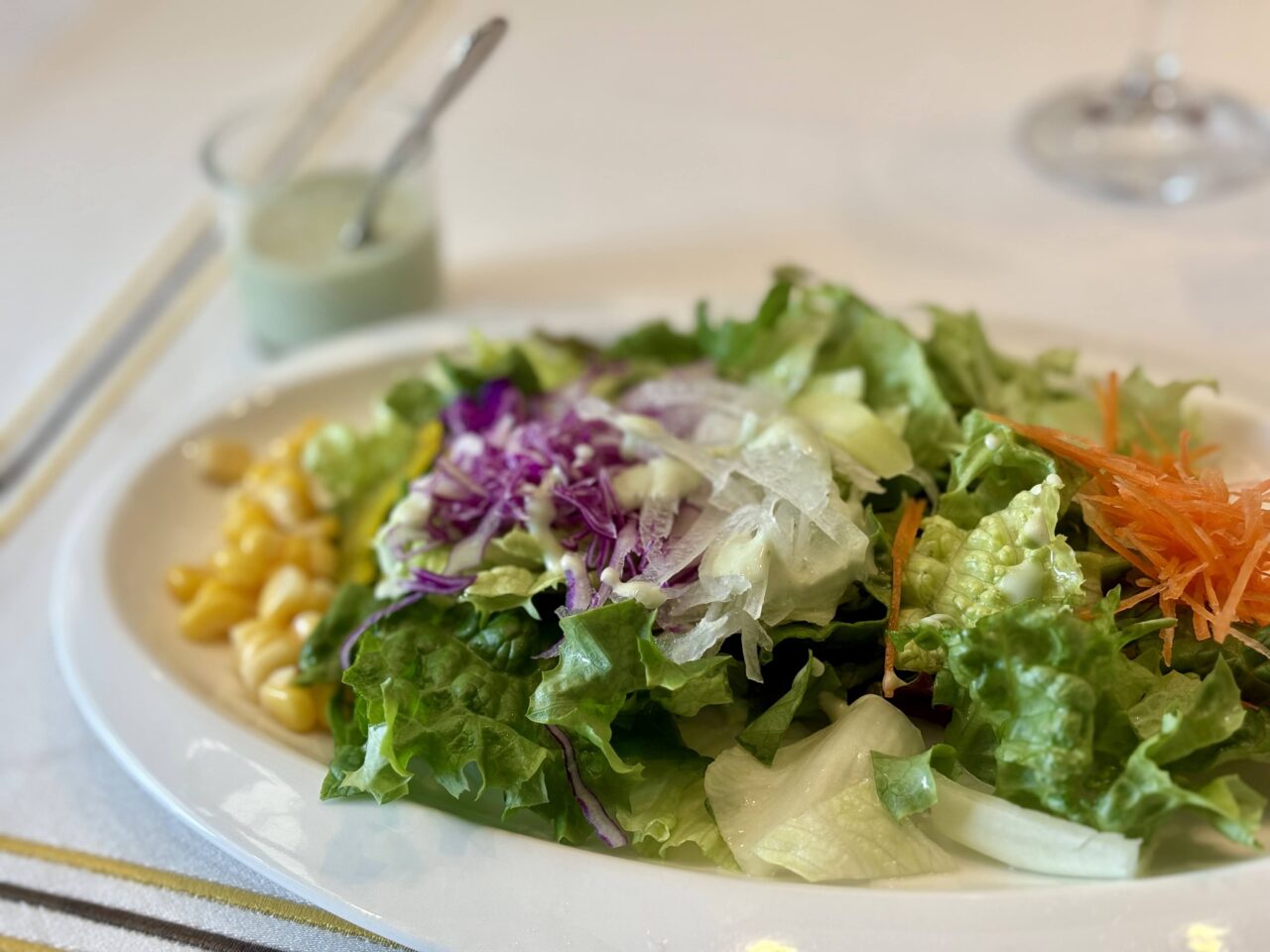 ランチはサラダ、本日のスープ、ドリンク、パンorライスがセットになっています。