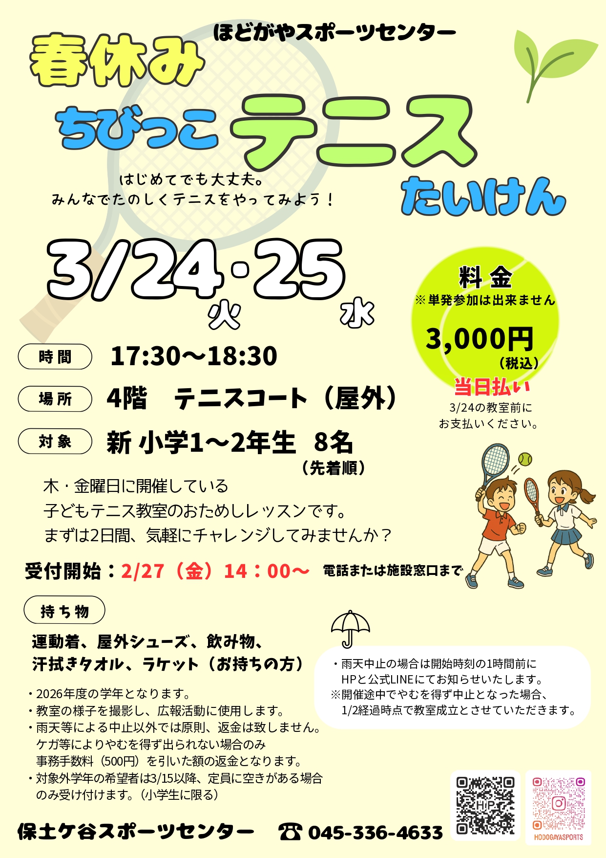 【横浜市保土ケ谷区】保土ケ谷スポーツセンターで春休みテニス教室が行われます。現在申込受付中!