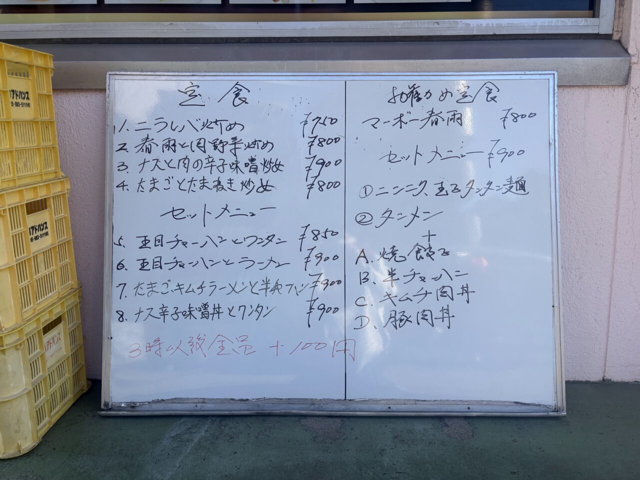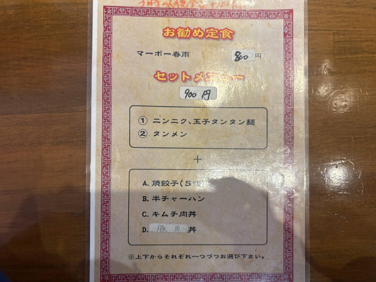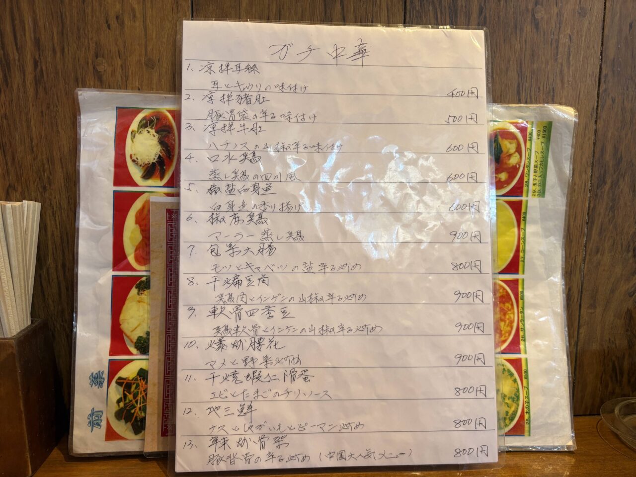 この日のランチメニューはこちら。手書きのメニューに街中華らしい親しみを感じます。