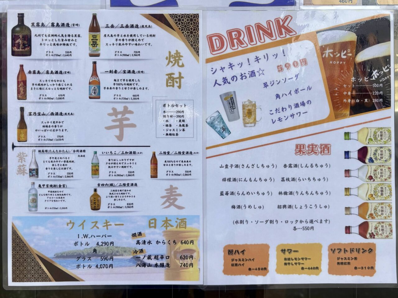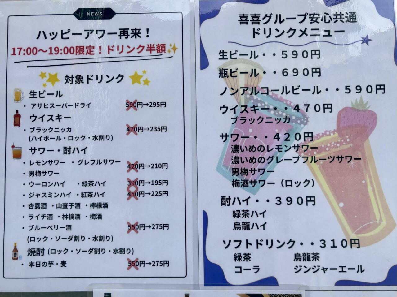 ハッピーアワー(17:00~19:00)はドリンクが半額になるそうですよ!生ビールが295円は格安ですね!