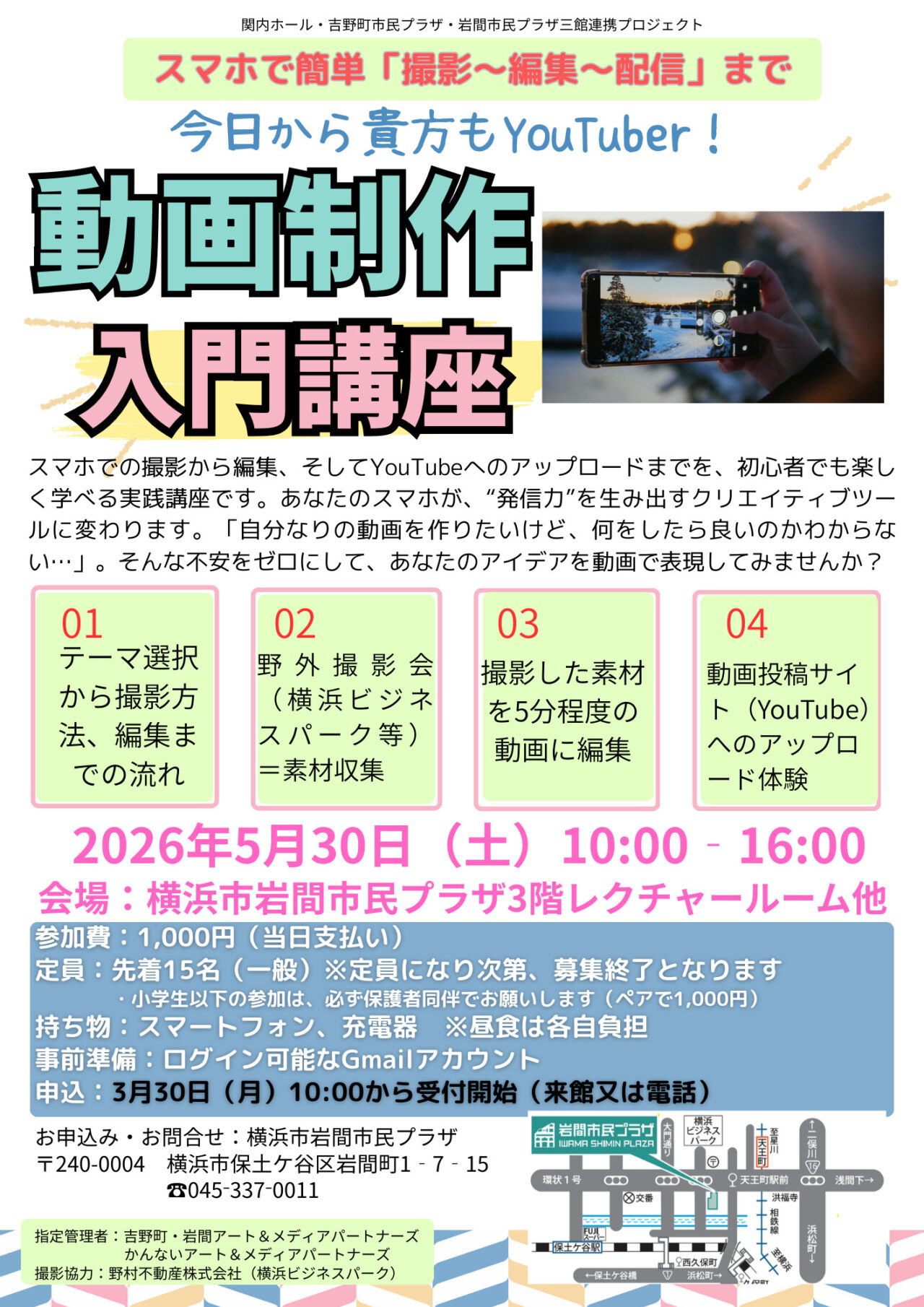 【横浜市保土ケ谷区】岩間市民プラザで「動画制作入門講座」が開催されます。申込は3月30日10時からスタート!