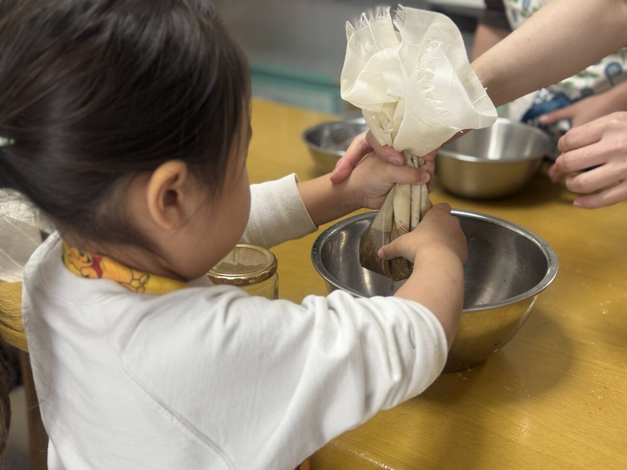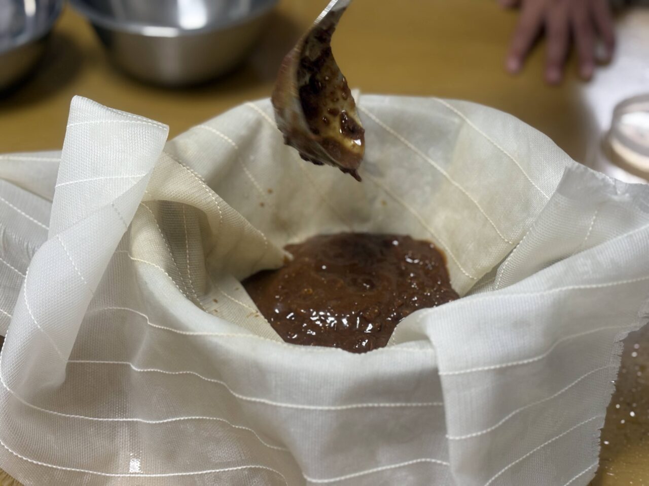 まずは、「醤油しぼり体験」。1年ほどかけて発酵したもろみ醤油を、清潔なふきんで絞ります。