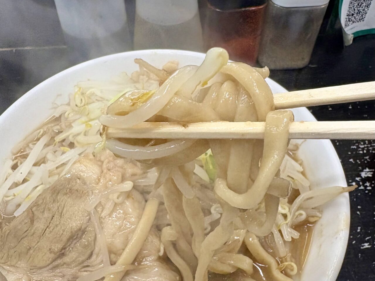 ご覧ください。二郎系と言えばの極太麺。割りばしよりも太い麺が、しっかりとスープに絡んでいます。